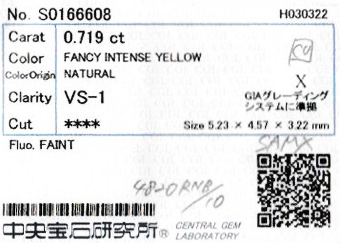 天然ファンシーインテンスイエロー ダイヤモンド 0.719ct