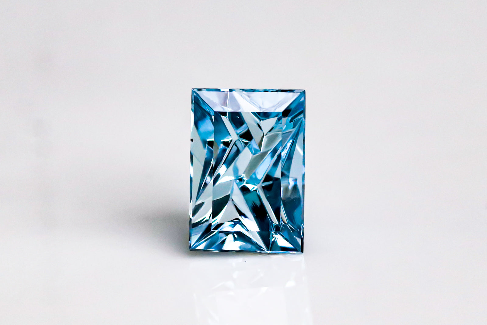 まるで水の彫刻。 シャープなスクエアシェイプに、芸術的なファセットを施されたこのアクアマリンは、ドイツカットならではの精密な技巧によって、“光と色の陰影”を楽しめる特別な逸石です。 アクアマリンというと、透明感を重視した淡い水色の印象を持つ方も多いかもしれません。 しかし、この石は違います。しっかりと色の乗った深みのある水色──その凛とした色彩が、シャープなエッジと交差しながら、見る角度によって表情を変えるさまは、まさにアートピースと呼ぶにふさわしい美しさです。 カットはただのスクエアではありません。 幾何学的で立体感のあるファセットが多方向からの光を受け止め、宝石内部で反射を繰り返すことで、色の濃淡、光のリズム、奥行きのドラマが生まれています。 このカット技術は、アクアマリンの持つ清廉な魅力を一段と引き上げてくれるだけでなく、他にはない“陰影”という感情的な美しさを宝石に宿してくれます。 ペンダントにすれば、胸元で凛とした輝きを放ち、 指輪に仕立てれば、静かに主張する上質な個性を添えてくれるでしょう。 大量生産には決してない、“一点もの”の空気感。 アクアマリンを知る人にこそ手にしてほしい、まさに一期一会の出会いです。