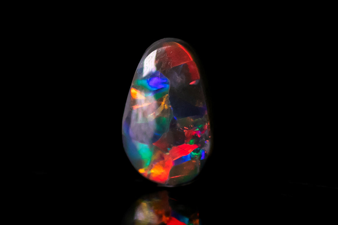 光が当たる角度や強さにより様々な色が現れるオパールならではの現象を遊色効果と言います。遊色効果を持つオパールは他にも種類がありますが、ほんの少し角度を変えただけで、全く異なる宝石のようにドラマチックに色が変化するのはブラックオパールと、ボルダーオパールならではの特徴です。この特徴こそが他のオパールの追随を許さない魅力的なオパールとして最も高く評価される理由です。