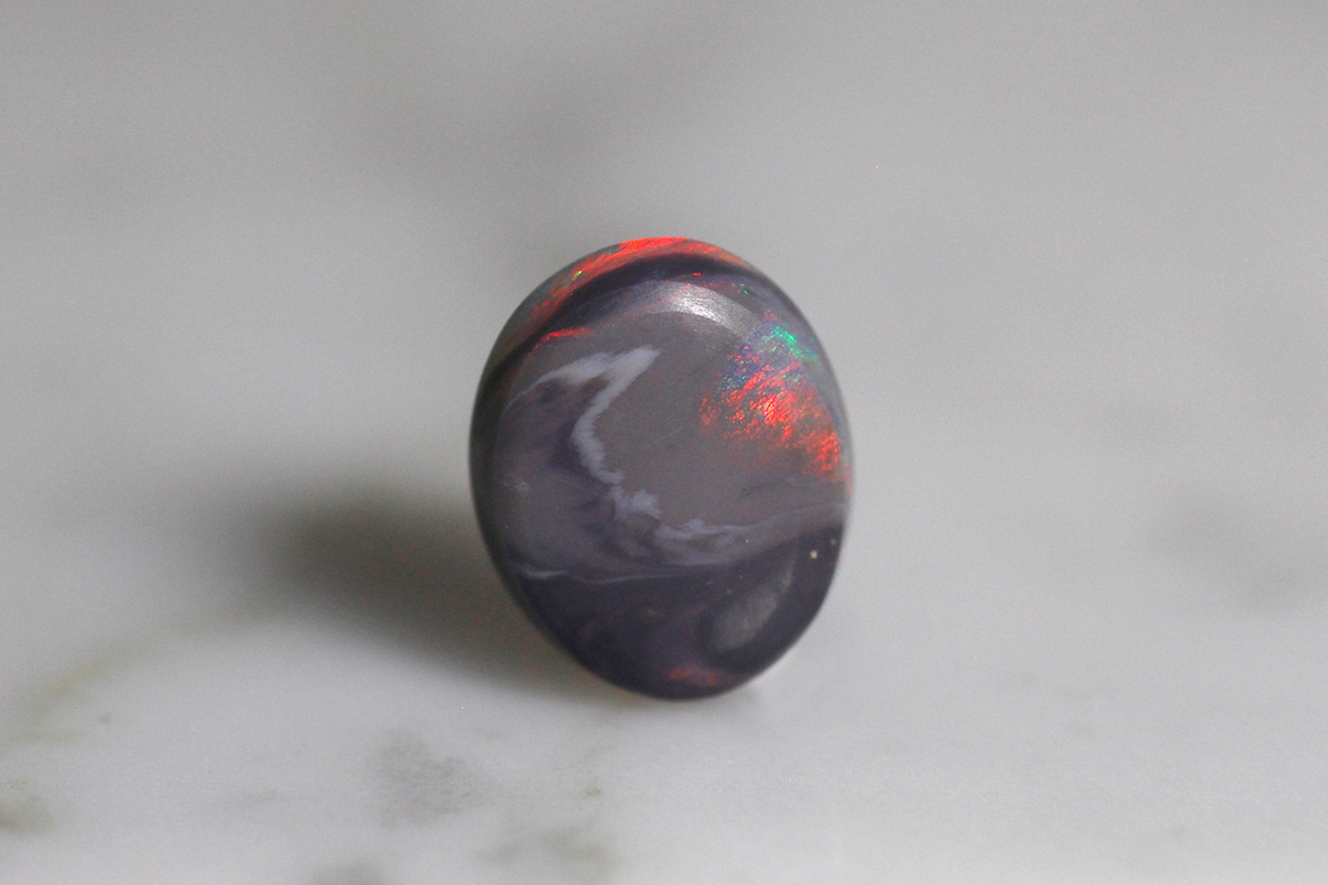 メラメラと赤斑がオパール層全体にしっかり現れるブラックオパール。