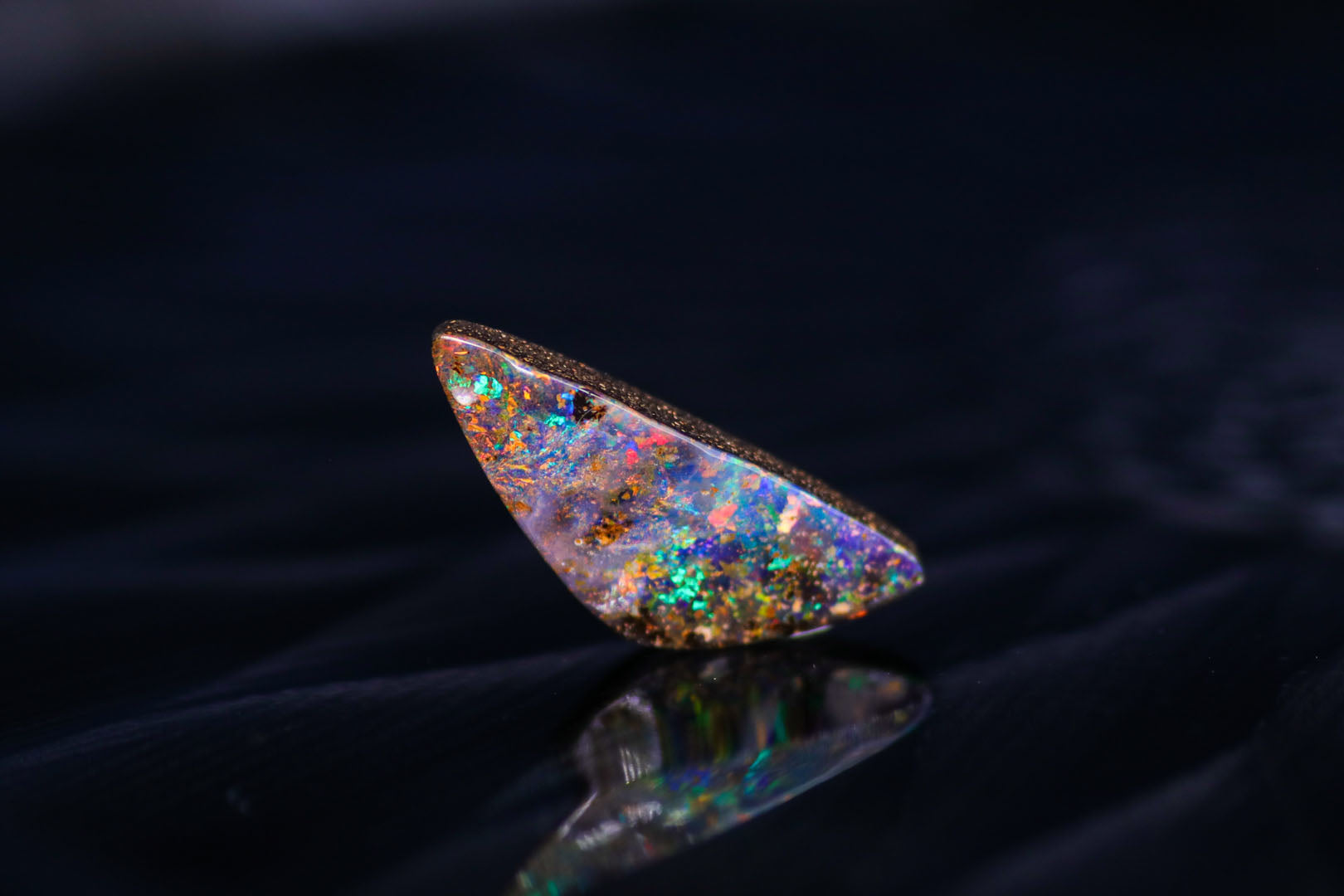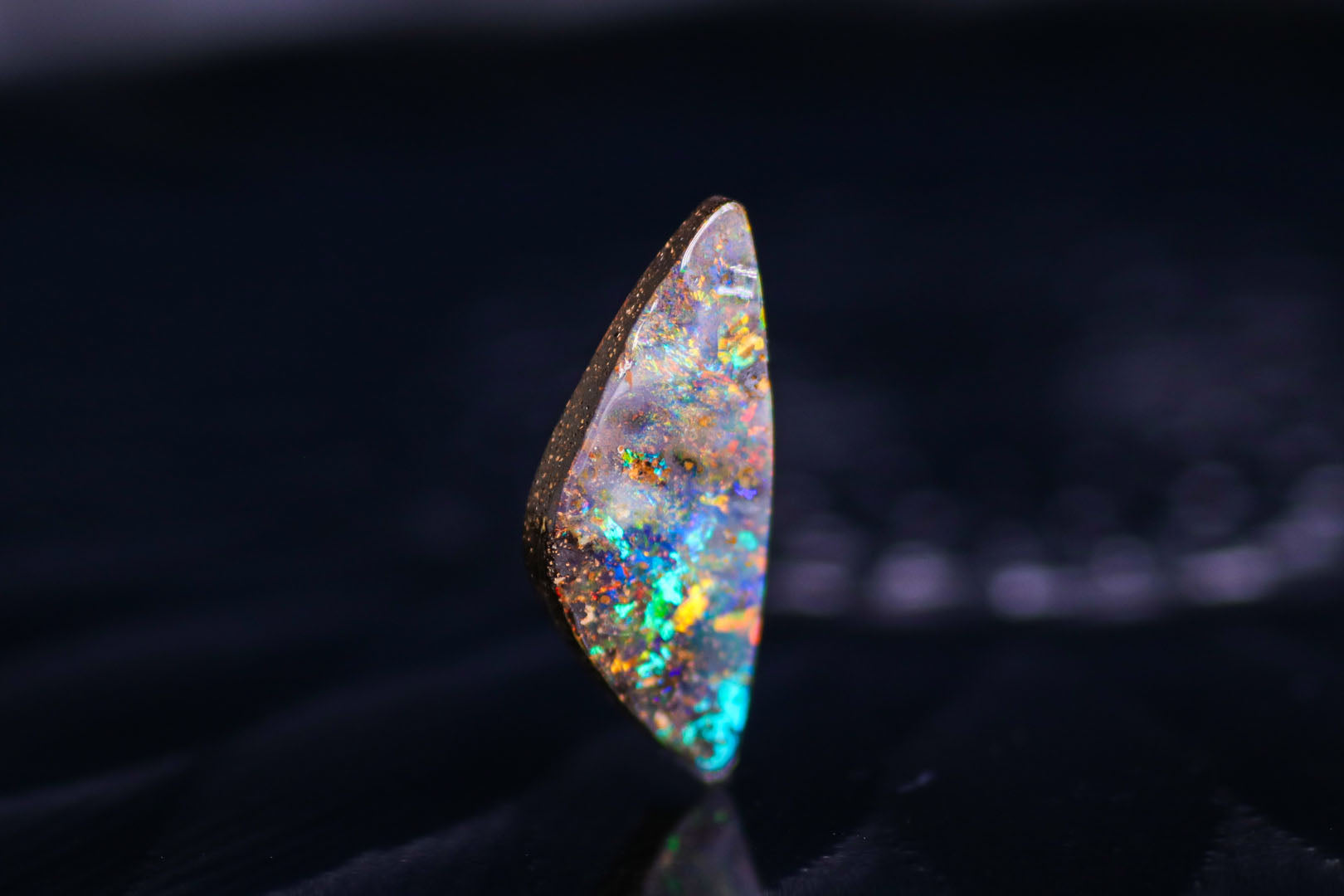 ブルー、オレンジ、グリーンの美しい彩りがダークブラウンの母岩の上を駆け回る美しいボルダーオパール。