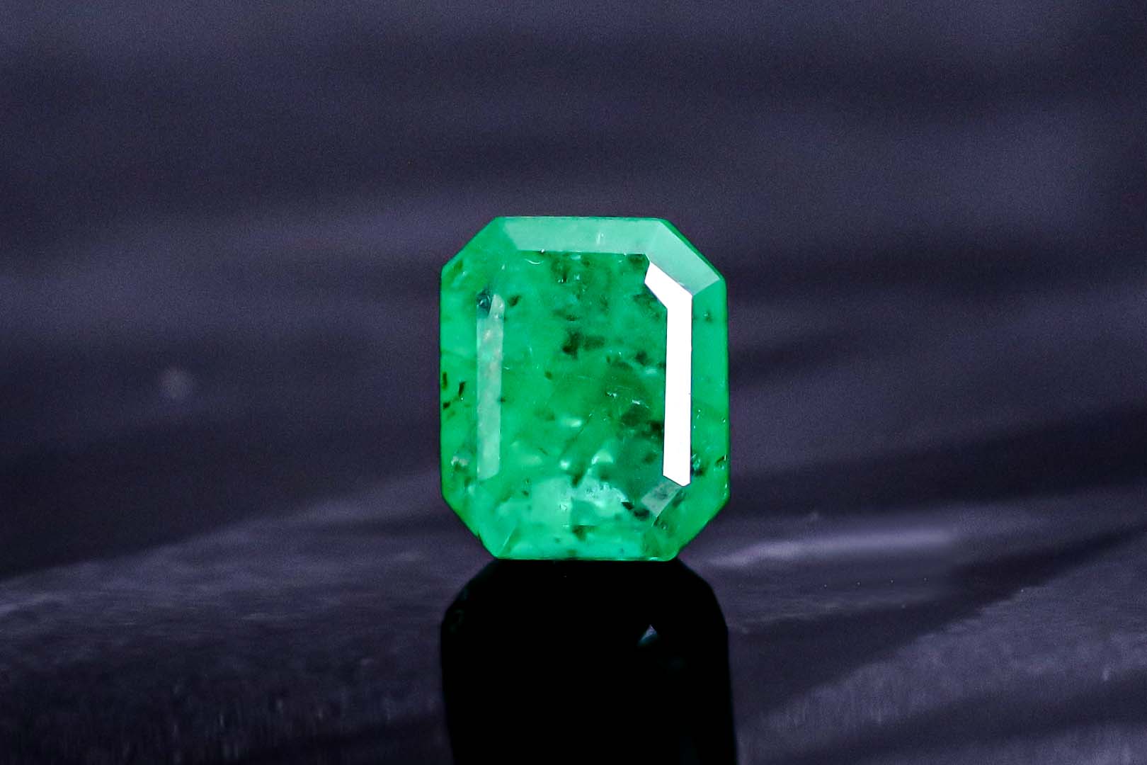 しっかりとした色が満遍なく広がり、エメラルドグリーンに惹かれた方の心をきっと満たします。その形も大変バランスの良いエメラルドカットで、美しさと品格を兼ね備えています。