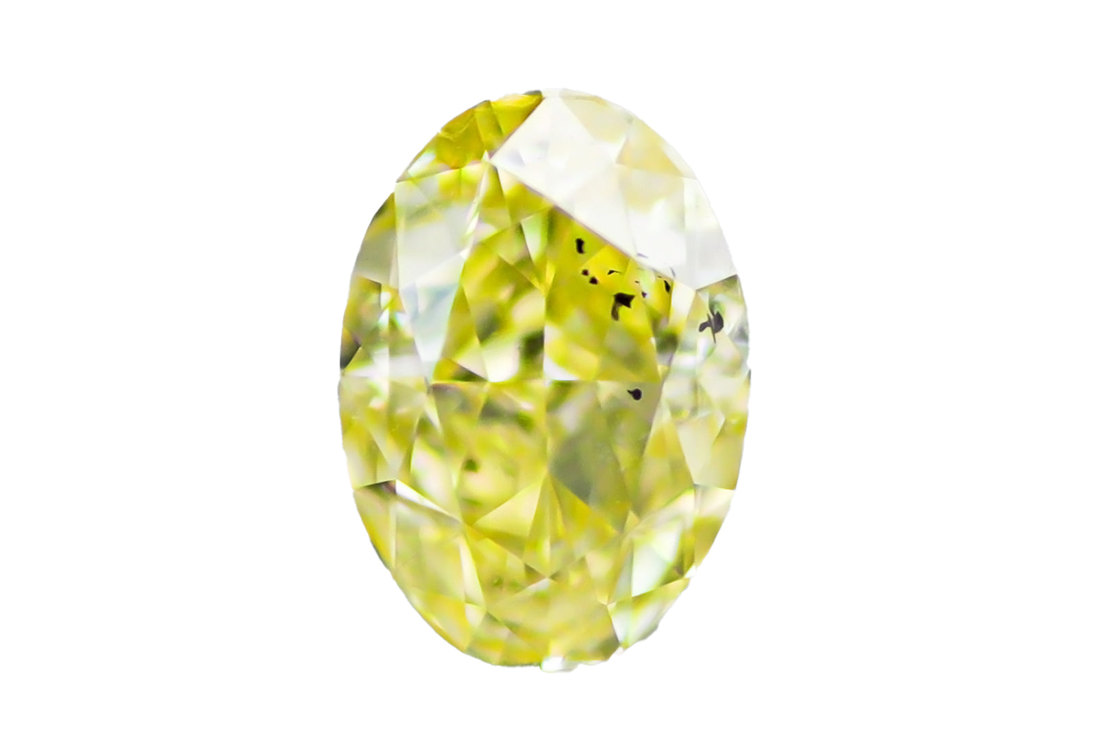 オーバルカットの表面いっぱいに広がる美しいイエローの輝き。インテンスイエローの中では若干落ち着いた色ですがオーバルカットならではの深みのある柔らかな輝きが魅力的なファンシーカラーダイヤモンドです。