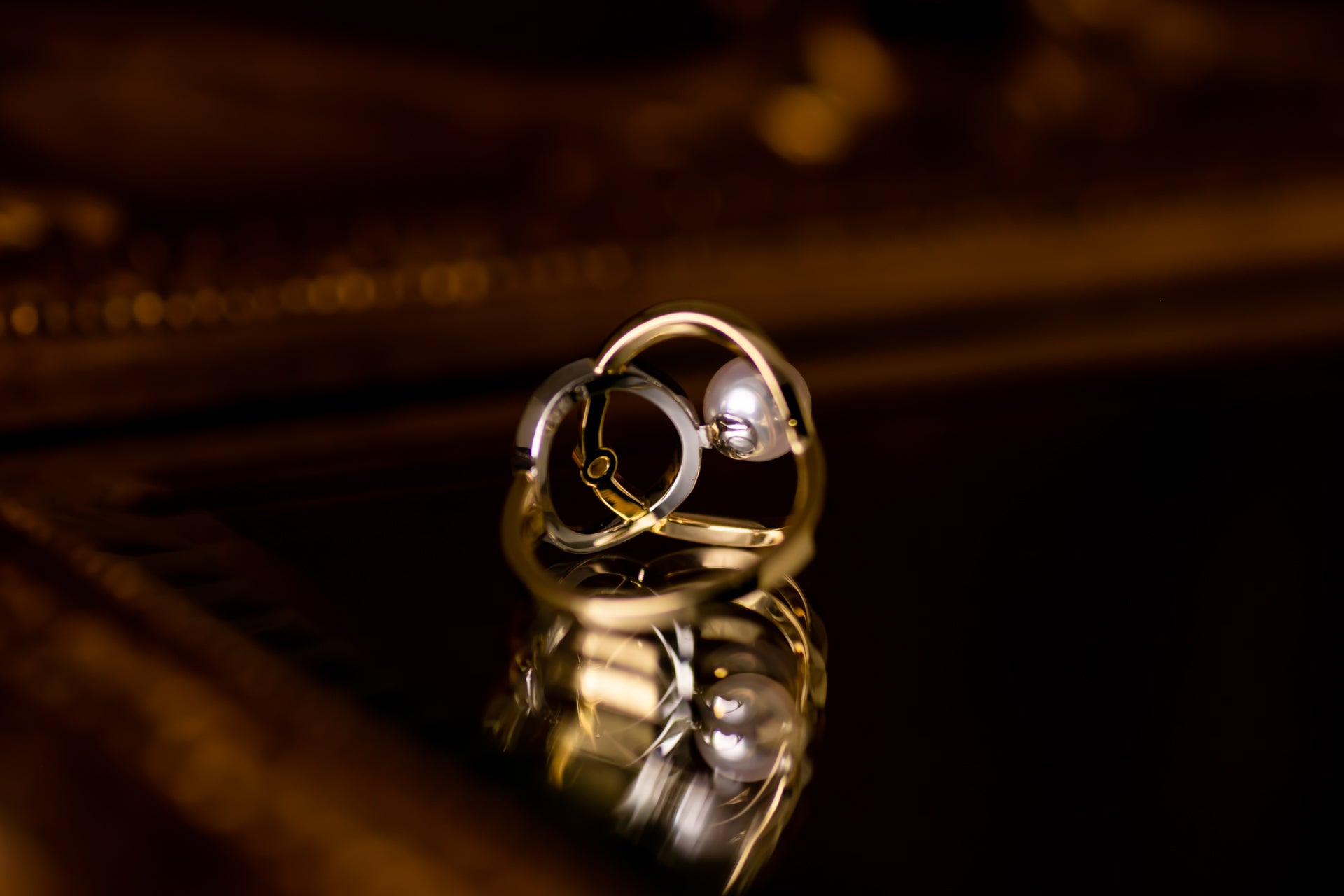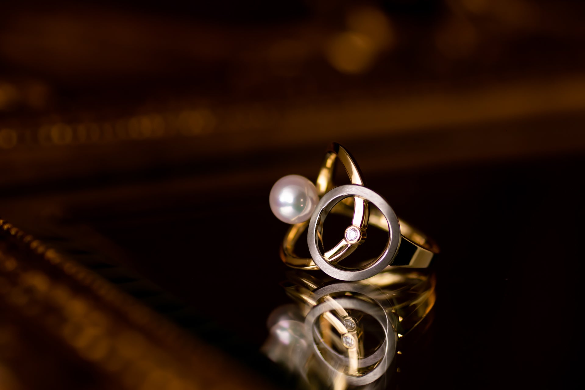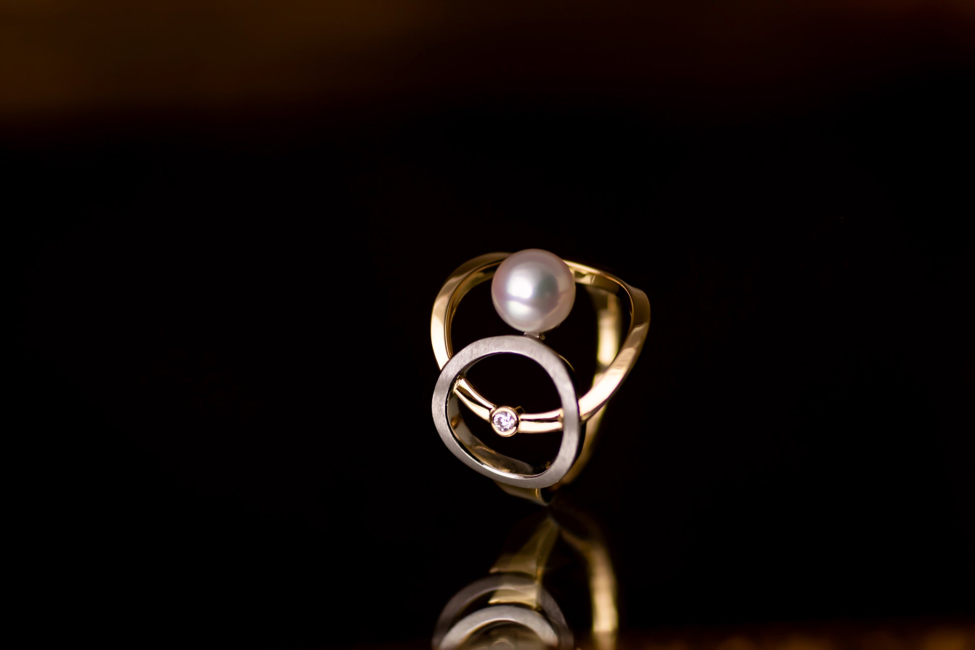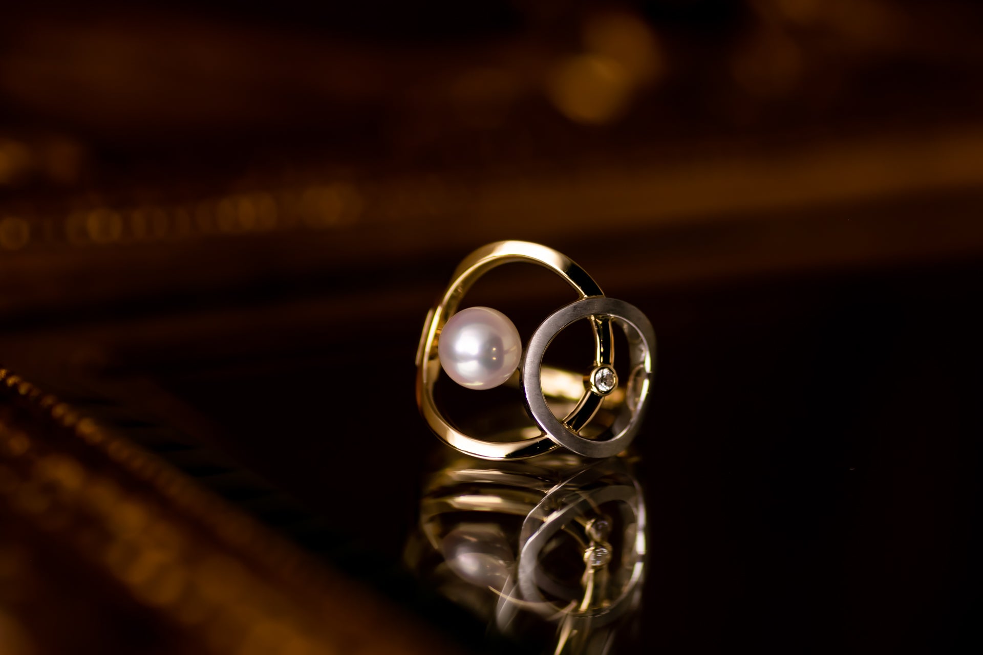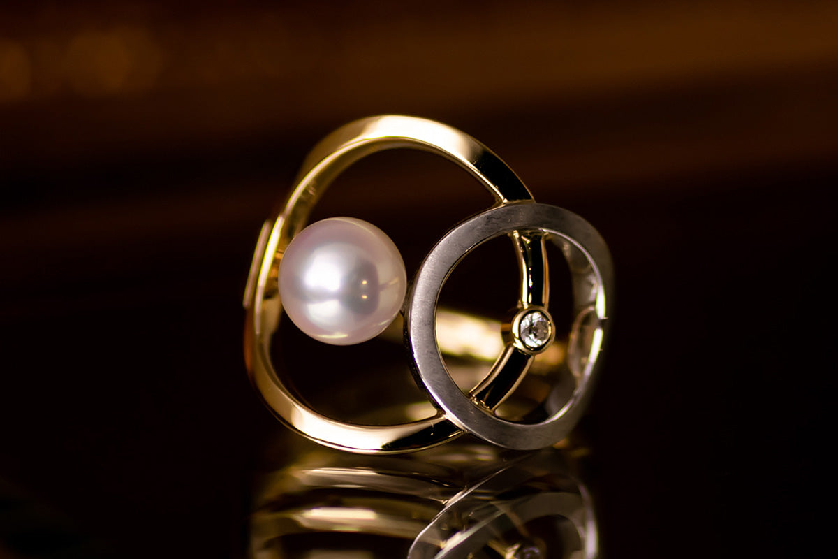 ふたつの輪が重なりお互いを引き立て合う。選び抜いた国産あこや真珠とダイヤモンドをシンプルかつ大胆なデザインが引き立てるデザイン。