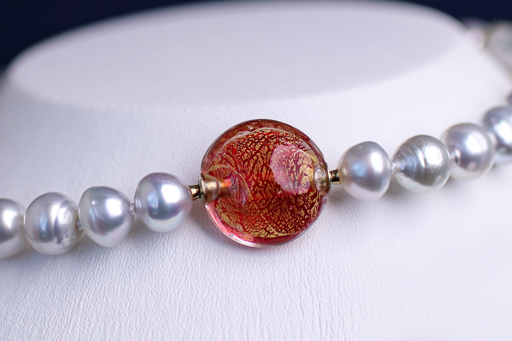 個性豊かな白蝶真珠の“かたち”を活かした、お洒落なネックレスです。真珠は真ん丸が希少で価値があると言われますが、一方で、いびつな形やサークル(輪のような模様)は、真珠がしっかり育った証として語られることもあります。均一に整った完璧さではなく、ひと粒ごとに違う表情があるからこそ、装いに抜け感とこなれ感が生まれ、さらりと身につけるだけで“わかっている”雰囲気にまとまります。