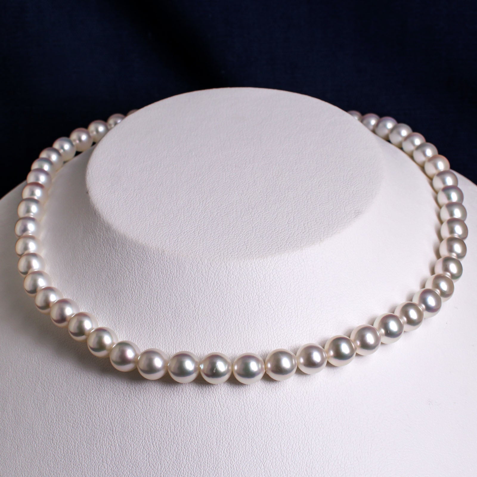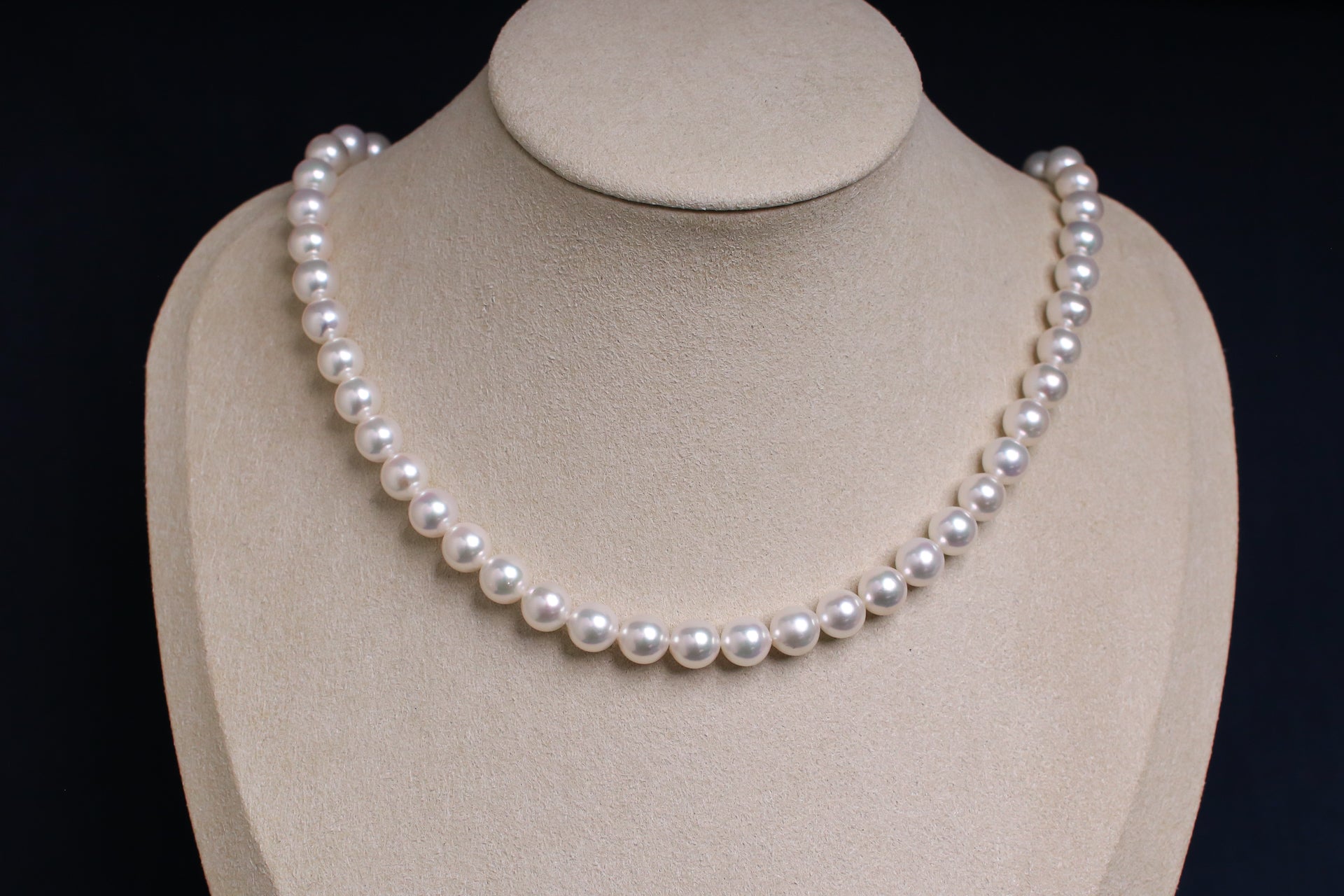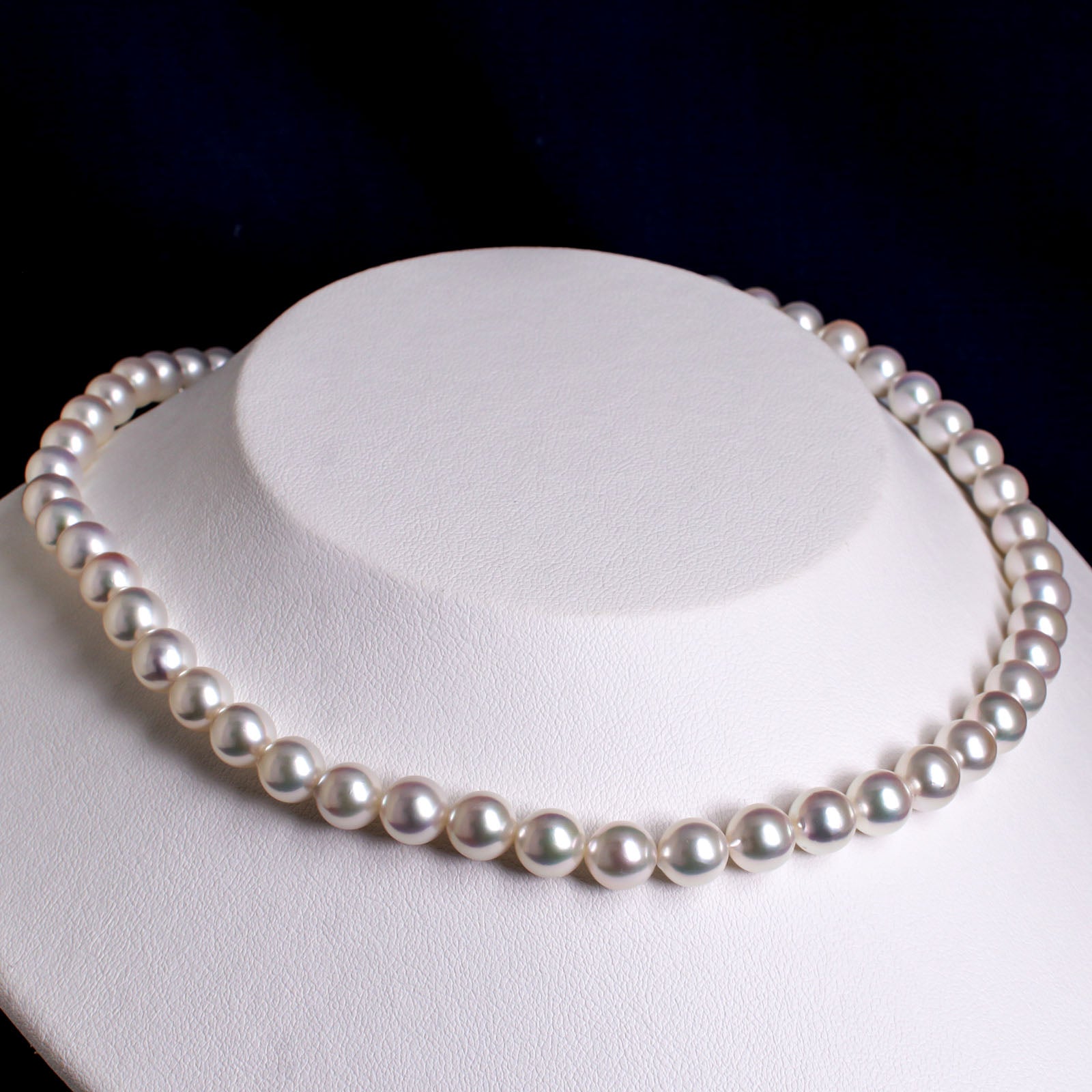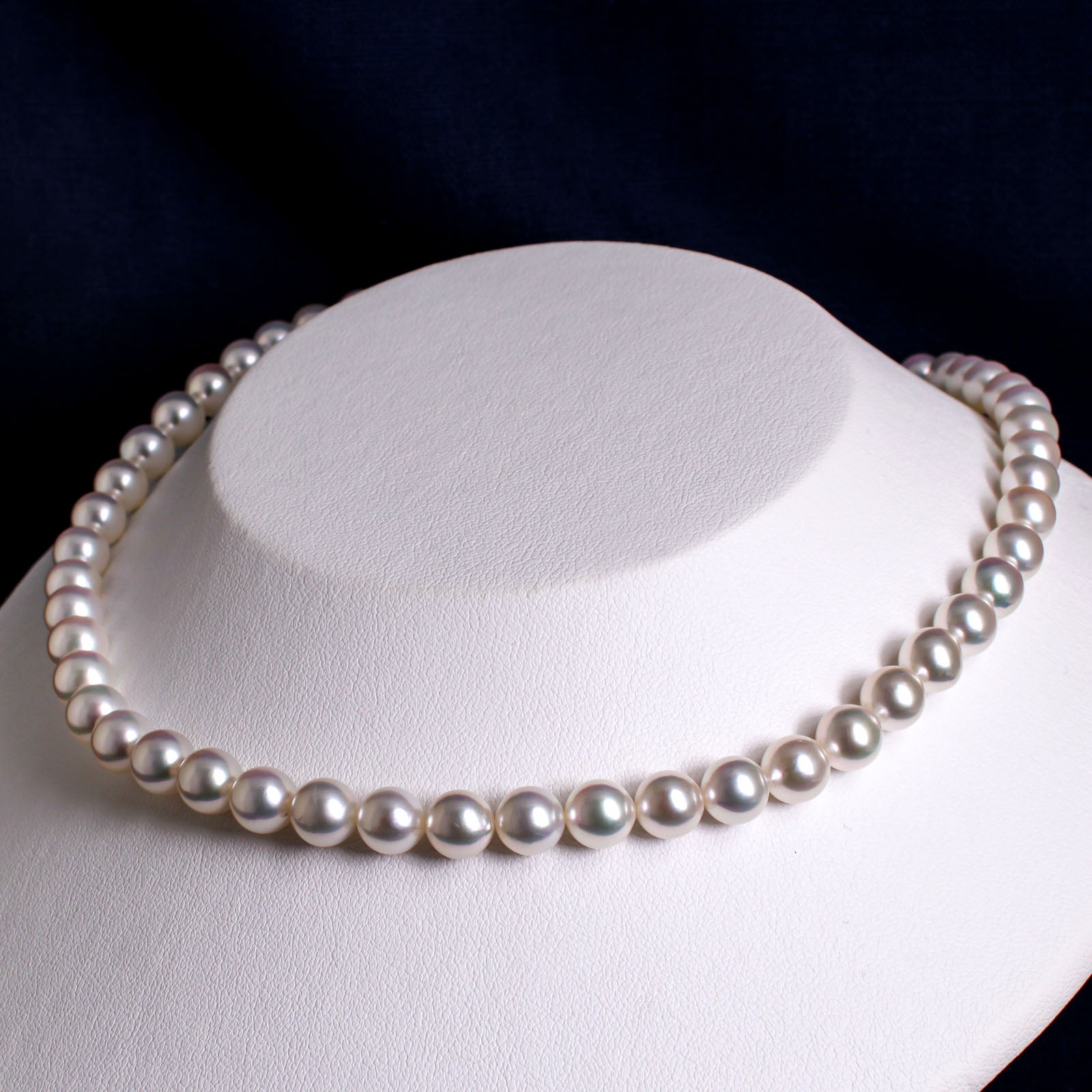 バランスの良い無調色ホワイトのアコヤ養殖真珠ネックレス。強いテリと明確な干渉色、厚い巻きが揃い、形はわずかに個性がある程度。小キズもごく軽微で、全体の上質感がしっかり際立つ一本です。