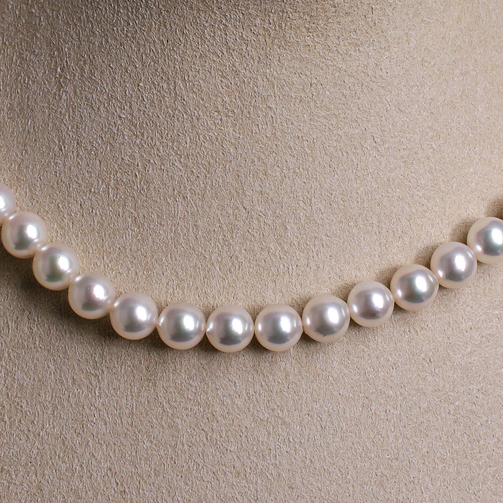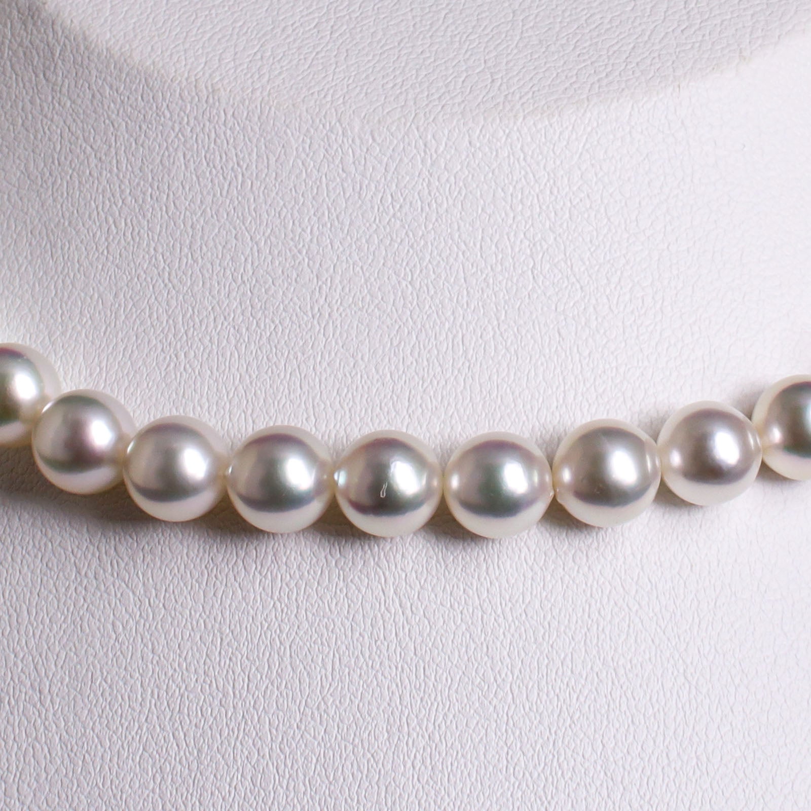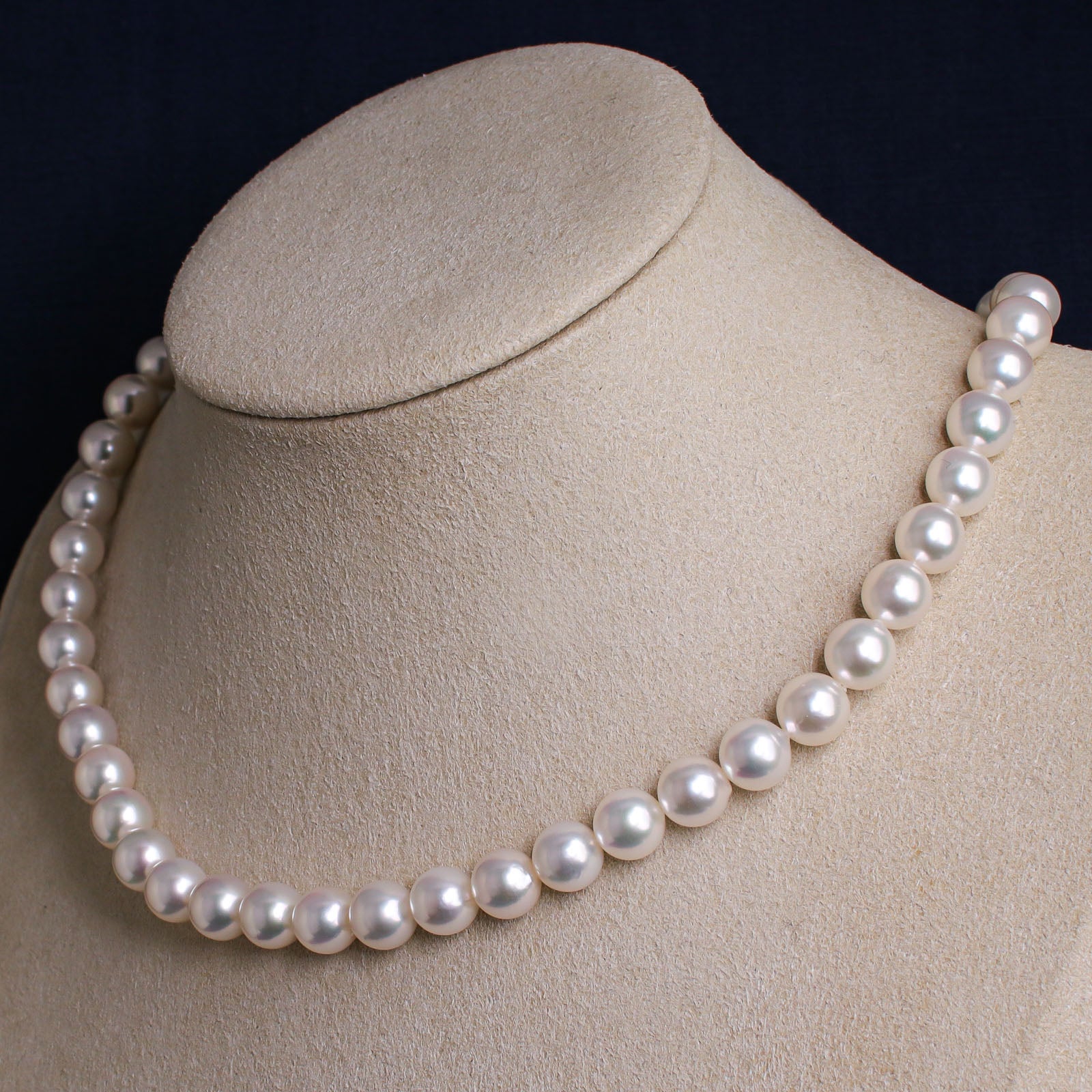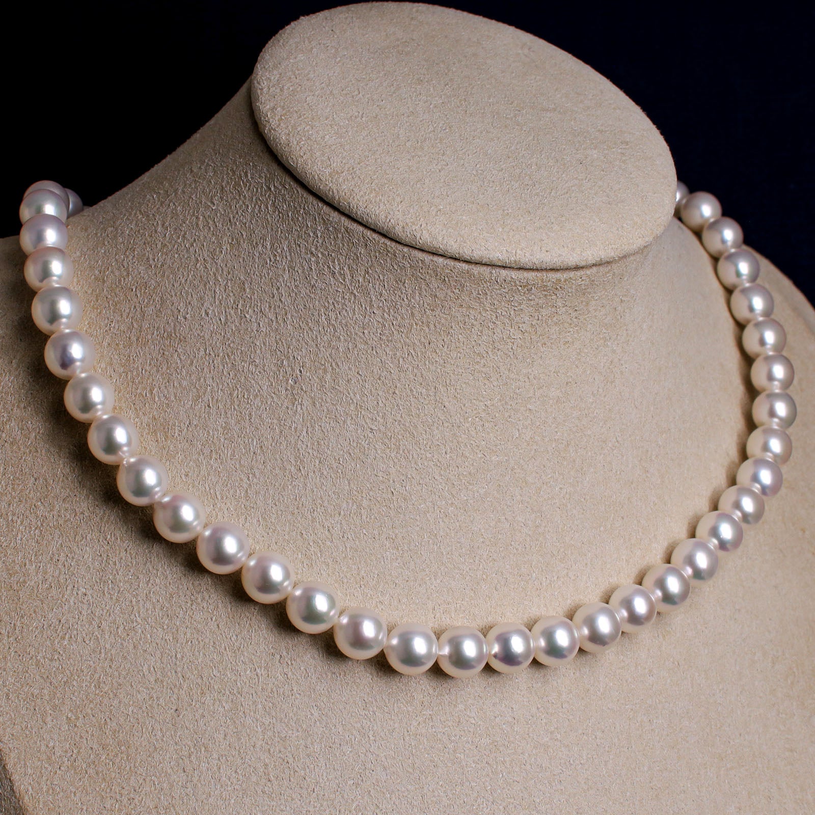 バランスの良い無調色ホワイトのアコヤ養殖真珠ネックレス。強いテリと明確な干渉色、厚い巻きが揃い、形はわずかに個性がある程度。小キズもごく軽微で、全体の上質感がしっかり際立つ一本です。