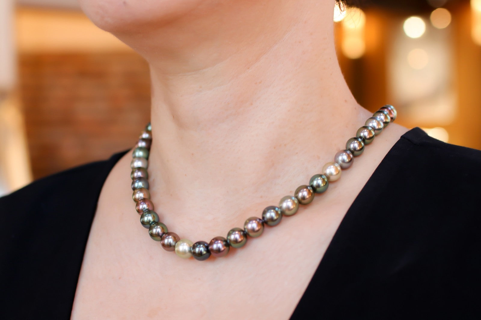 タヒチは天然由来の微細な表情が一般的です。着用時はテリが勝ち、全体の美観を損ねません。気になる珠位置は事前にクローズアップでご確認可能。
