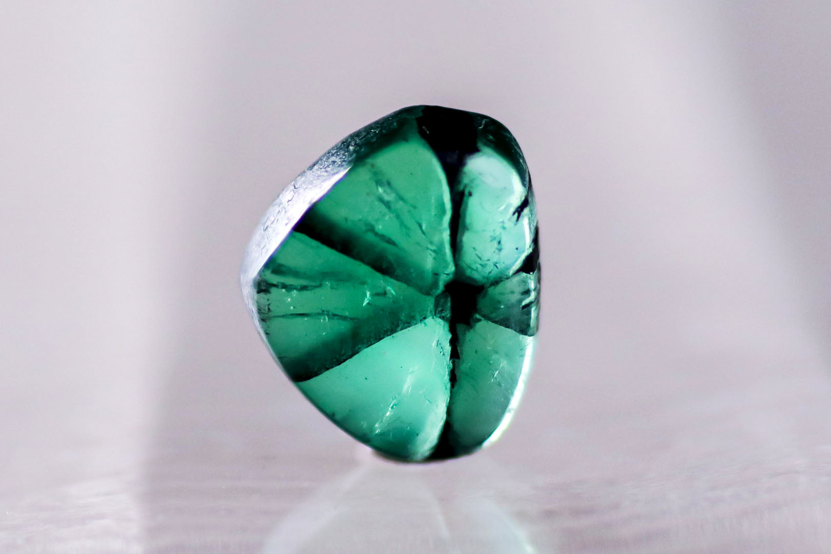トラピッチェエメラルドといえば、亀の甲羅模様のようでとても面白いと評判ですが、こちらの逸石はその甲羅らしい丸さはない宝石。