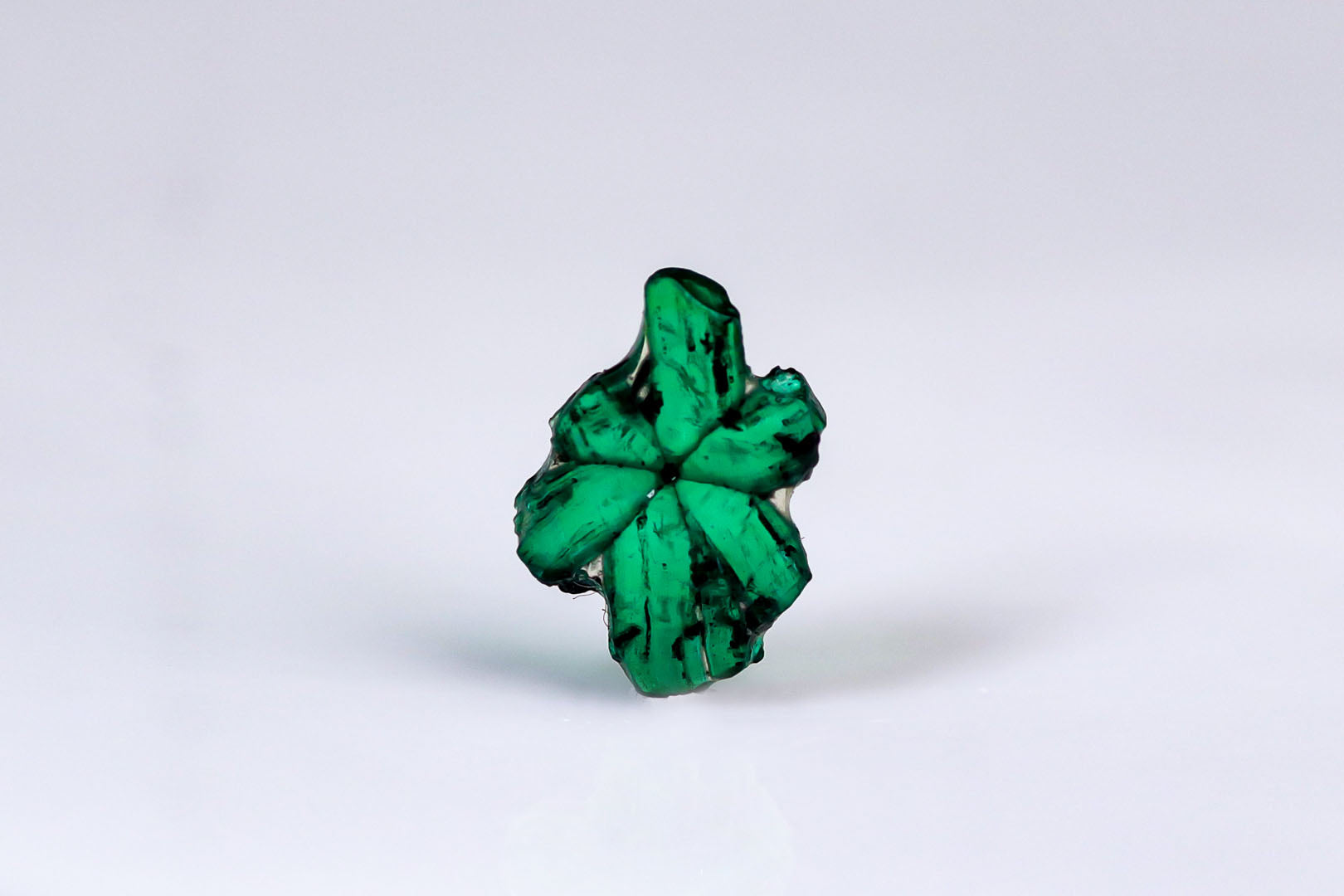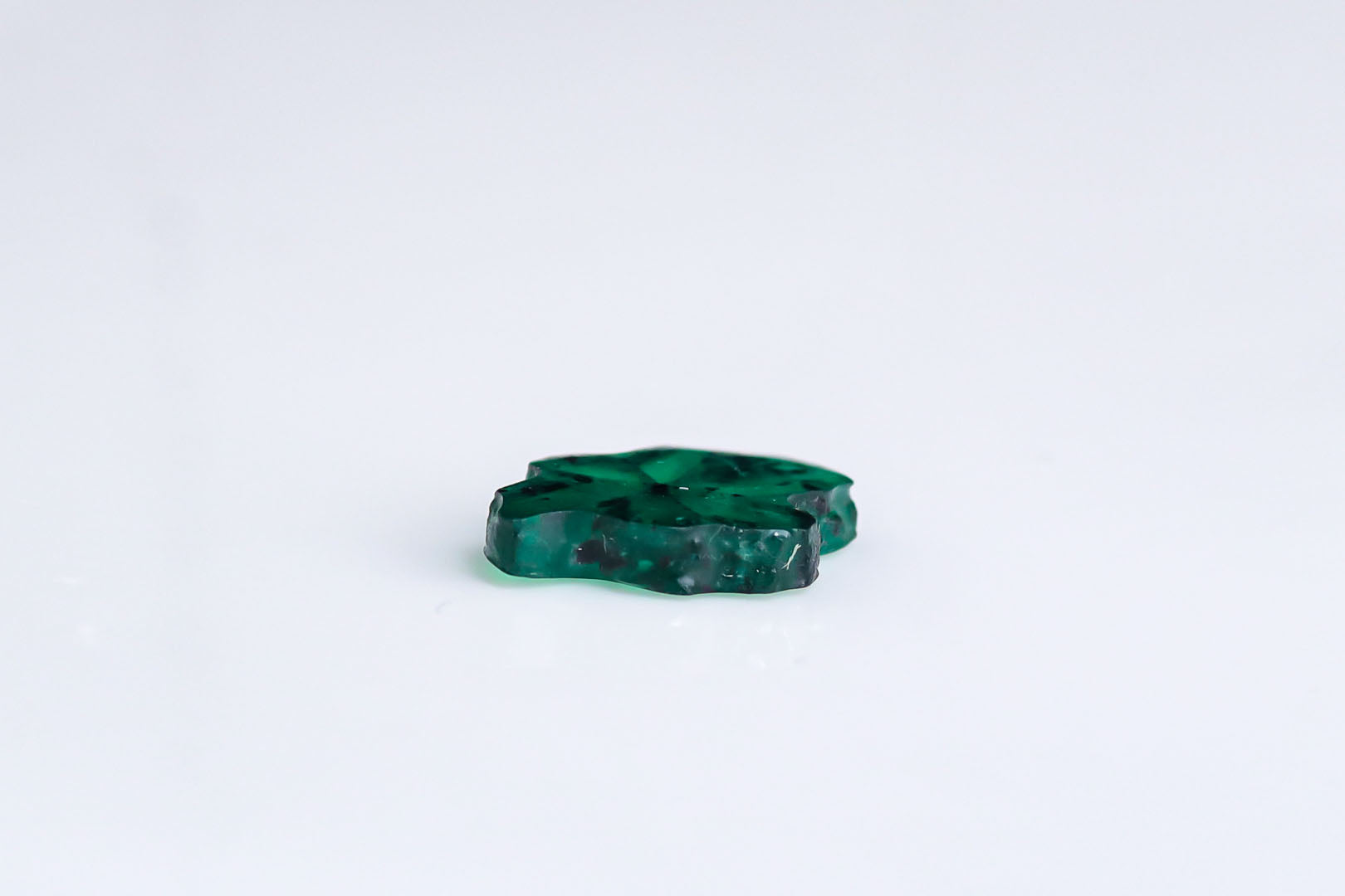 こちらのトラピッチェエメラルドは、1.4カラットのサイズに濃く鮮やかなグリーンが広がり、その美しさが際立つ特別な一石です。自然が生み出したまさに芸術品であり、葉っぱを思わせるような個性的なカタチもまた、この石の魅力のひとつです。